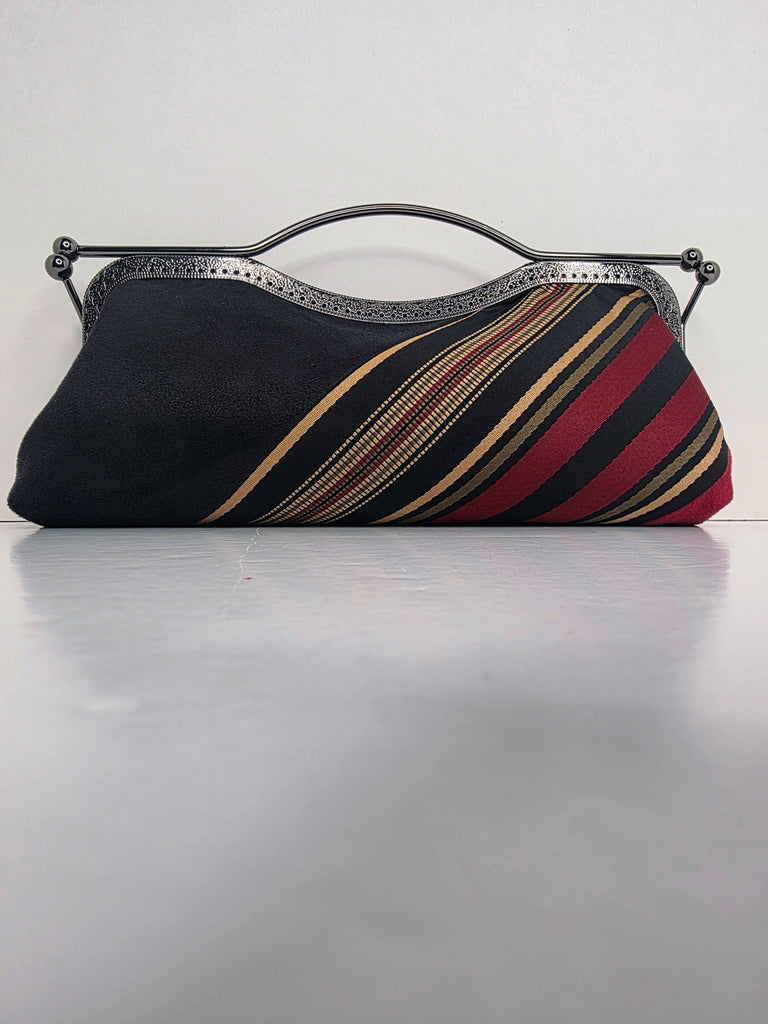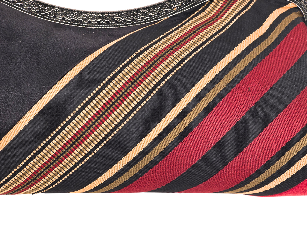 This elegant handbag beautifully balances soft texture with a bold pattern. One side is crafted from plush, deep red faux suede, providing a rich, velvety feel that is comfortable to hold. The other side is accented with a striking diagonal woven stripe panel in a sophisticated palette of black, deep red, gold/tan, and a subtle metallic thread, offering a tailored, vibrant contrast.